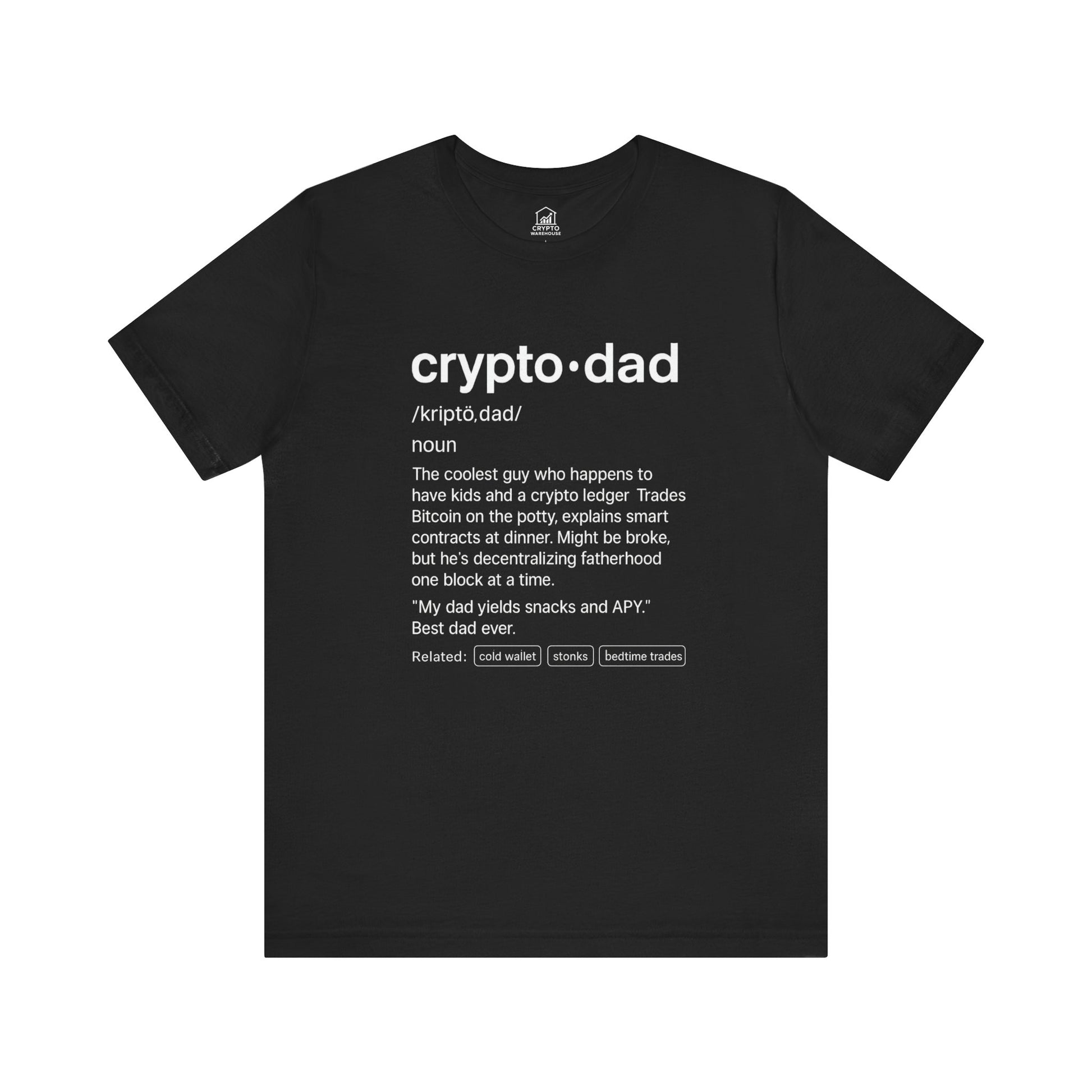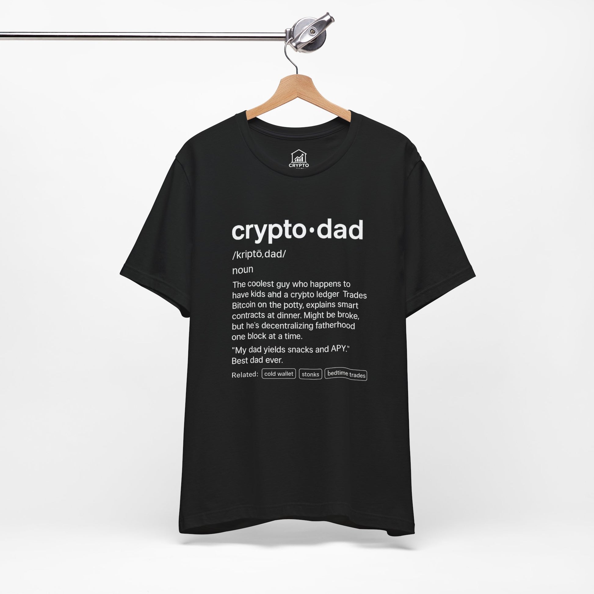Celebrate the most legendary multitasker in Web3 — the Crypto Dad. This tee features a clean, witty definition-style design that captures what it really means to raise kids and manage bags. Whether he’s trading Bitcoin from the bathroom or explaining DeFi at the dinner table, he’s doing fatherhood the decentralized way.