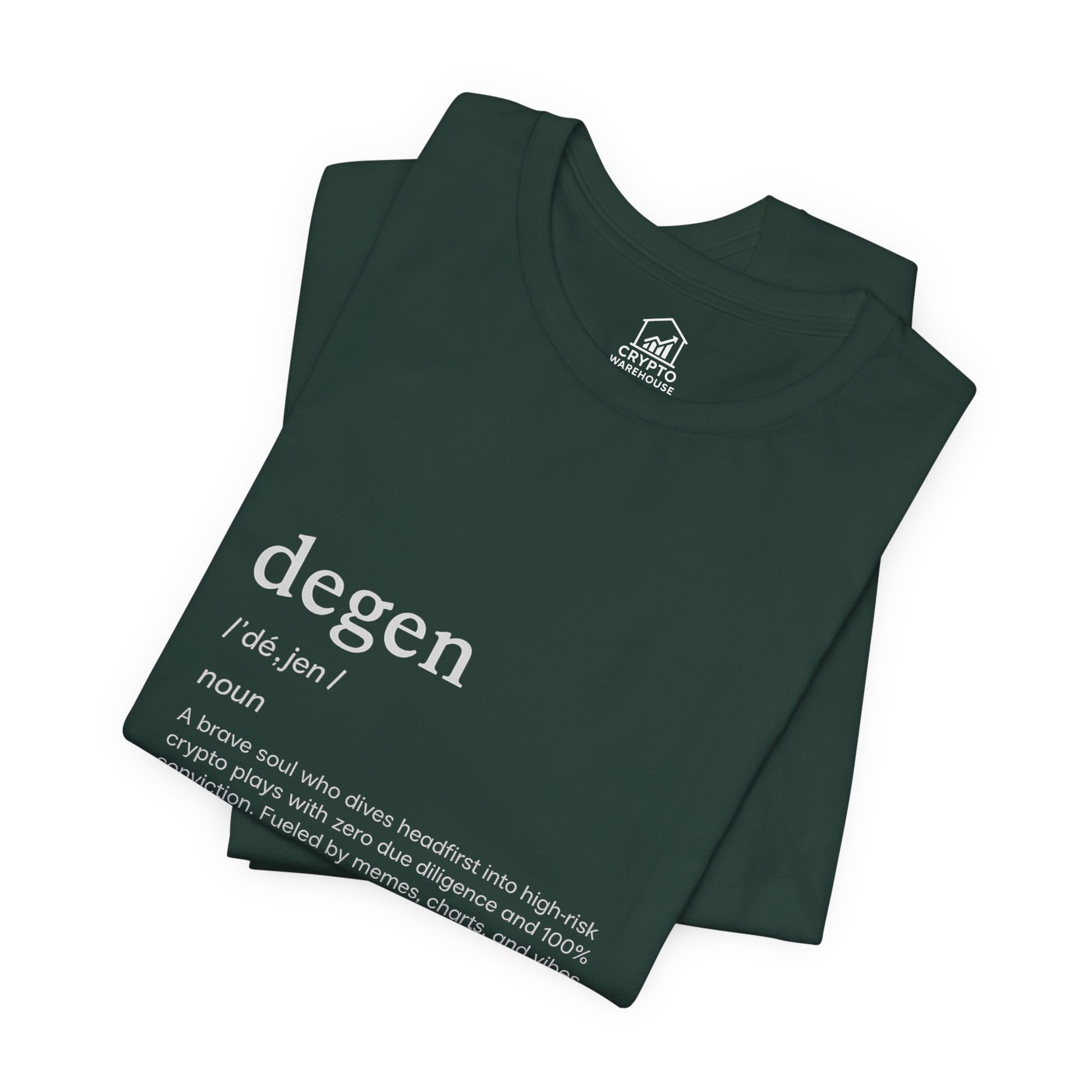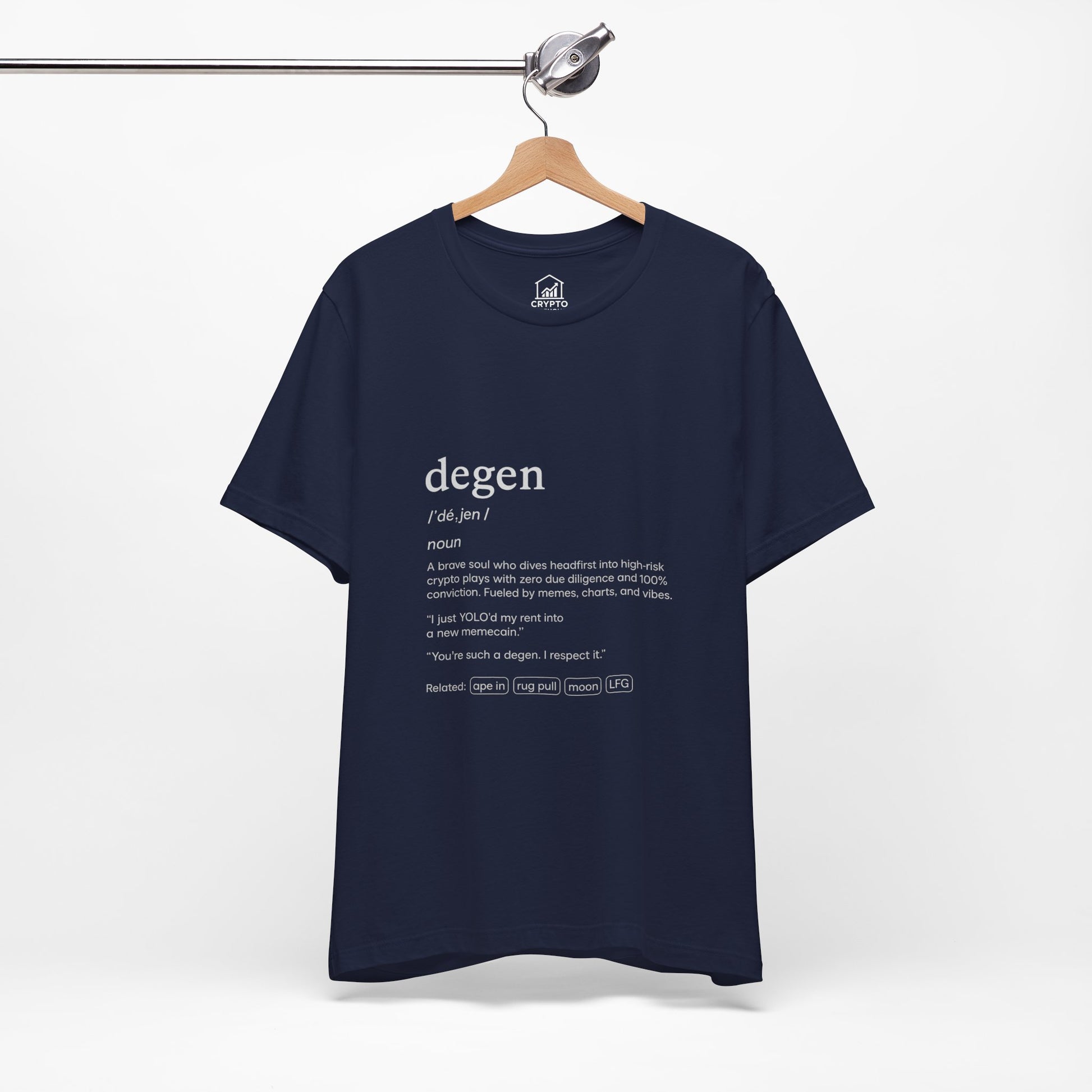 Calling all crypto risk-takers and midnight memecoin apes – this shirt is for you. The "Degen" tee hilariously defines the life of a true crypto gambler with zero chill and maximum conviction. Whether you're YOLOing your rent or chasing that next pump, wear your badge of honor proudly.