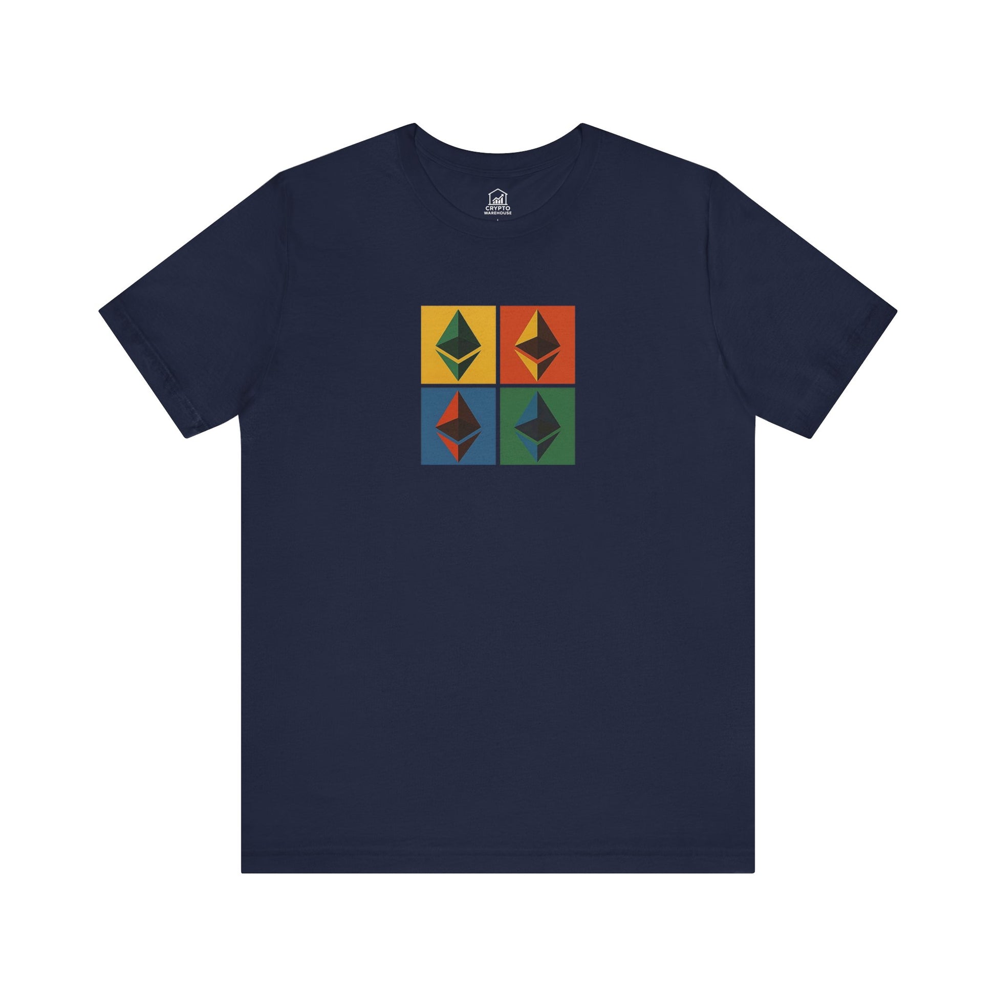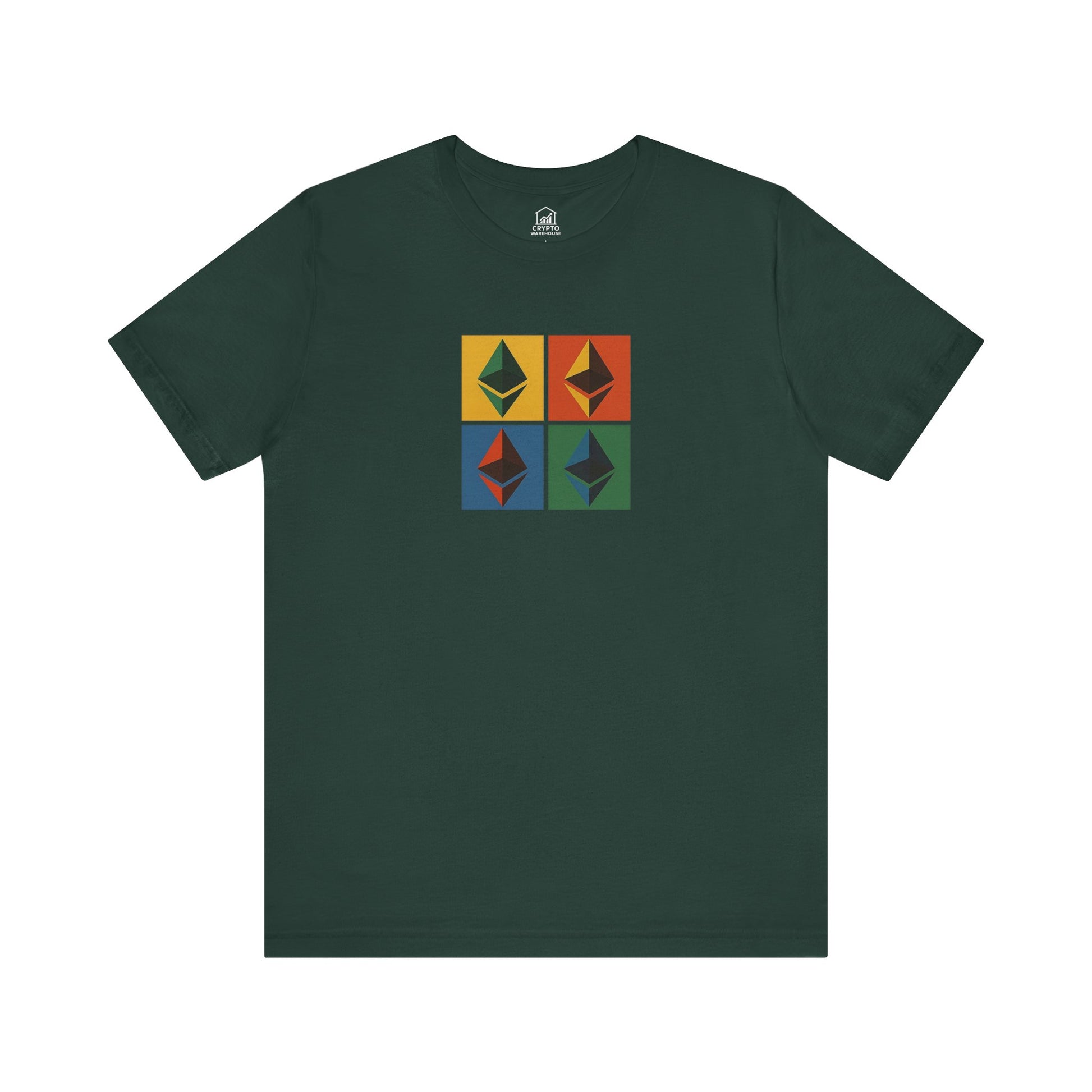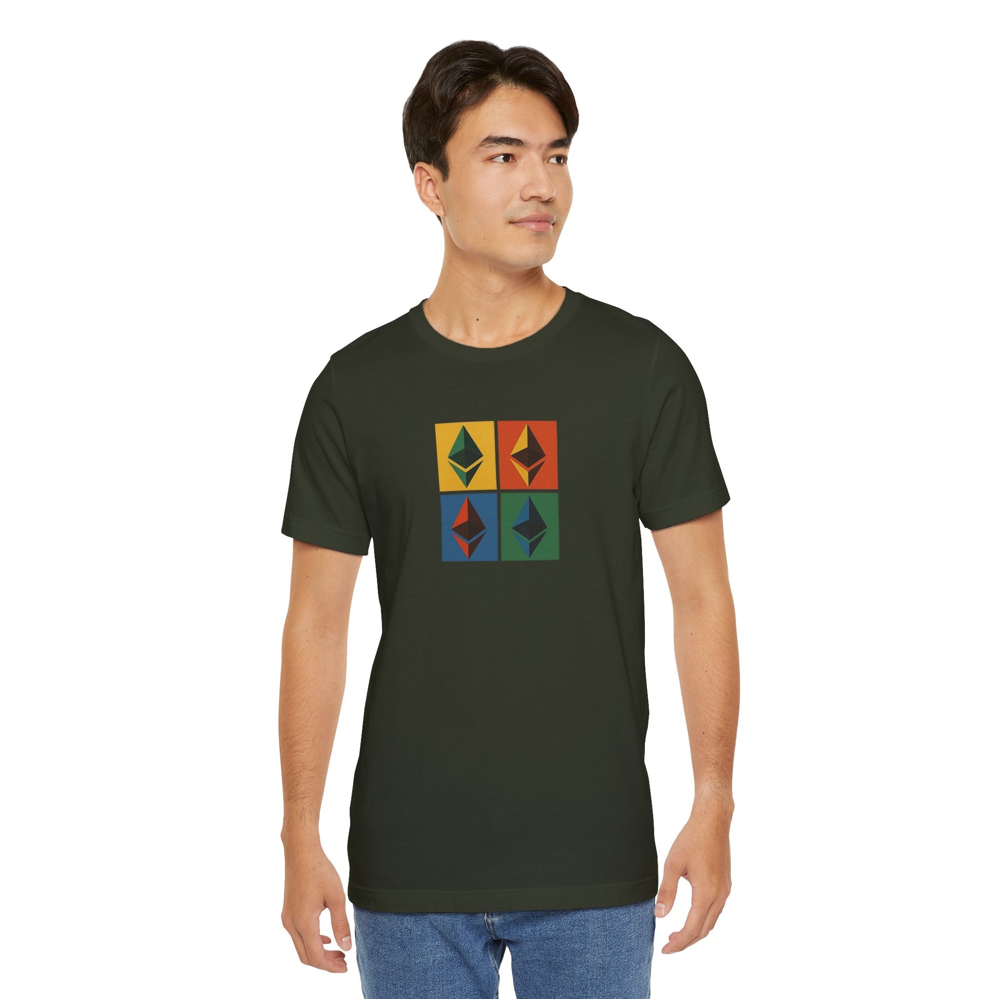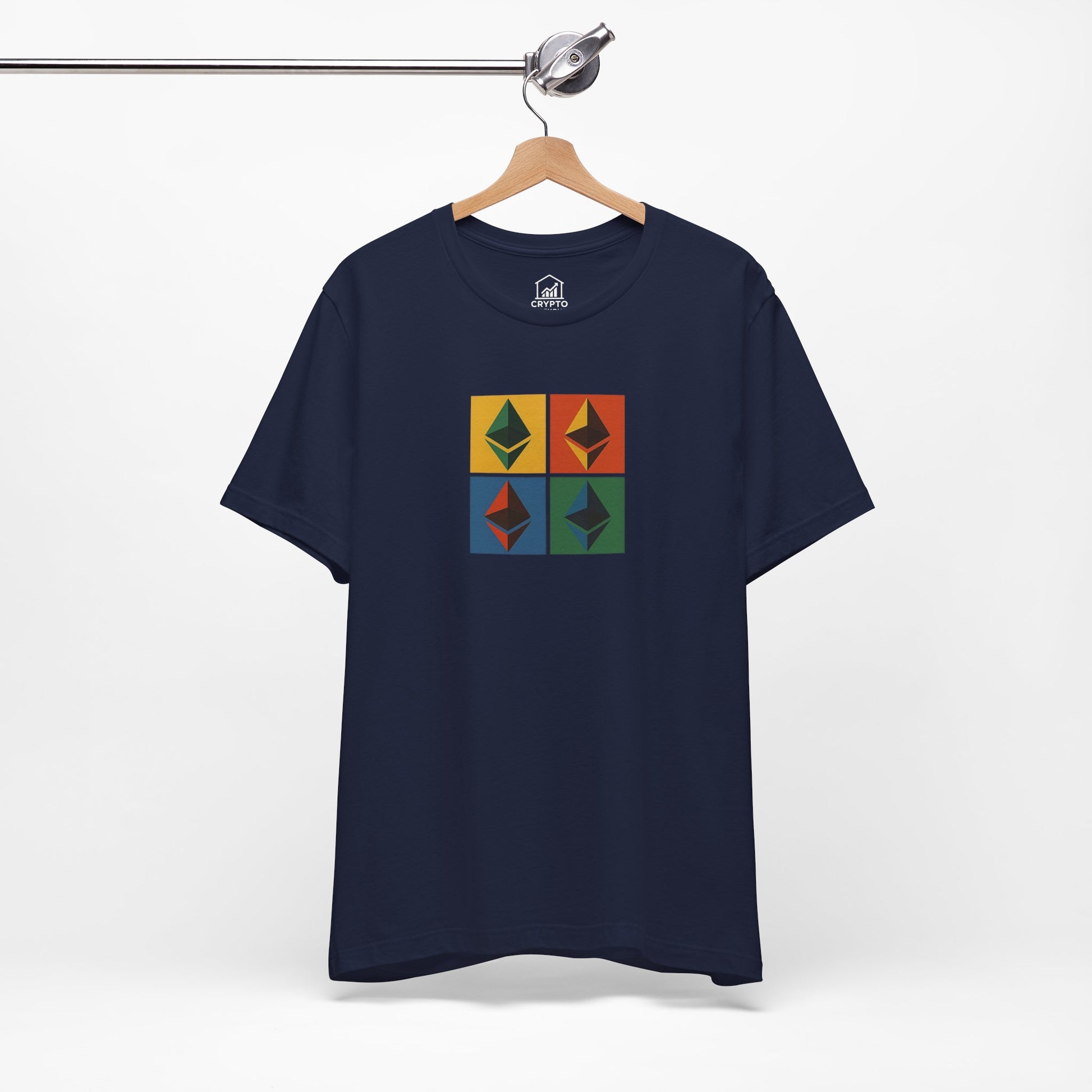 Ethereum Pop Art shirt. Ethereum shirt. Celebrate your crypto passion with this unique Ethereum Pop Art T-Shirt inspired by Andy Warhol’s iconic style. Featuring four vibrant Ethereum logos in bold, contrasting colors on a dark background, this minimalist design is perfect for blockchain enthusiasts, ETH investors, and NFT collectors.