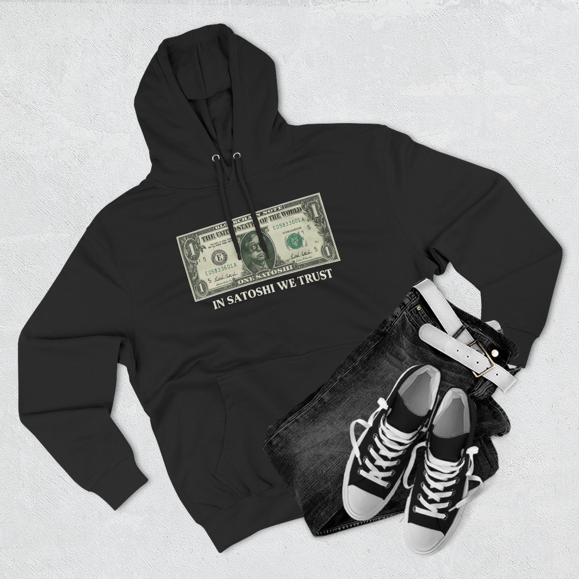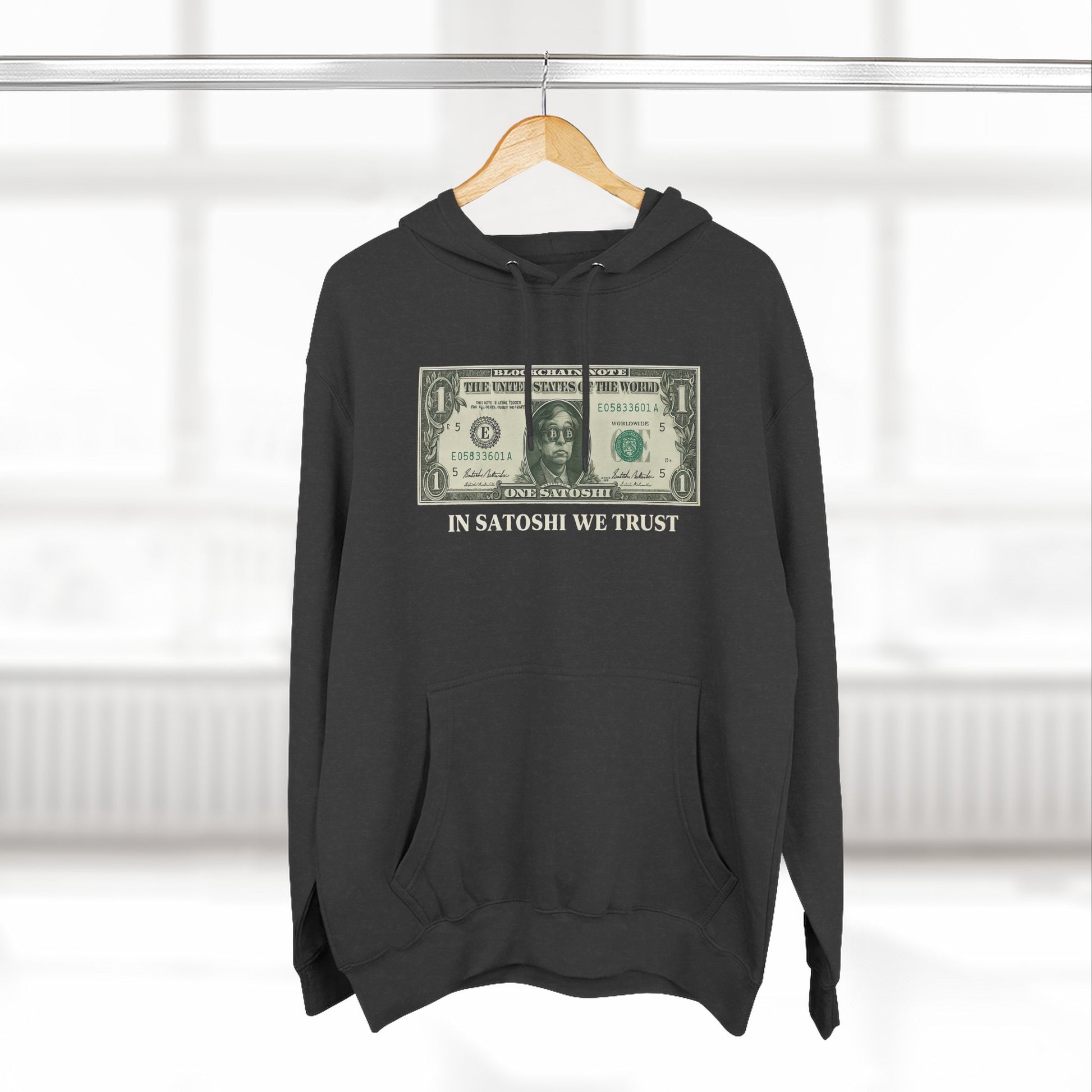 Make a bold statement in the world of decentralized finance with our âIn Satoshi We Trustâ hoodie. Featuring a satirical reimagining of the U.S. dollar billânow transformed into a âBlockchain Noteââthis design pays homage to Bitcoinâs mysterious creator, Satoshi Nakamoto. đ¸ The central figure wears Bitcoin-symbol shades and replaces the dollar denomination with âONE SATOSHI,â backed by a witty slogan that flips the fiat script: âIn Satoshi We Trust.â