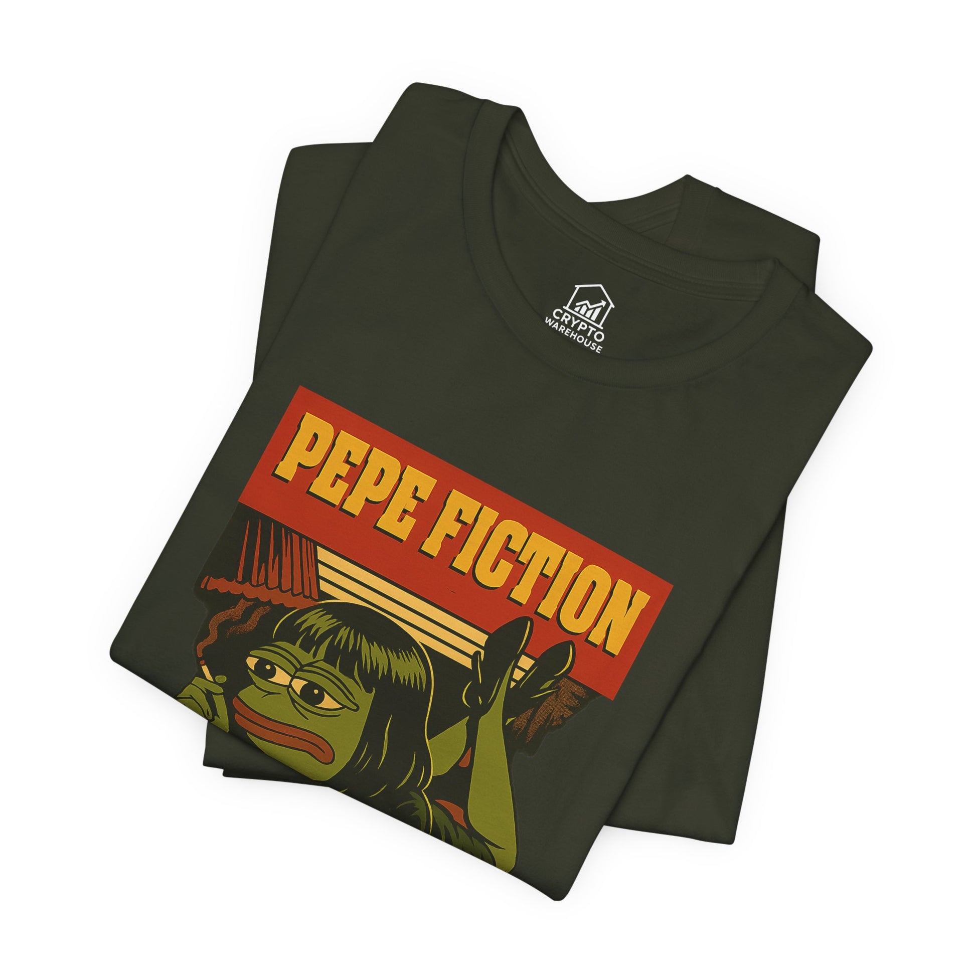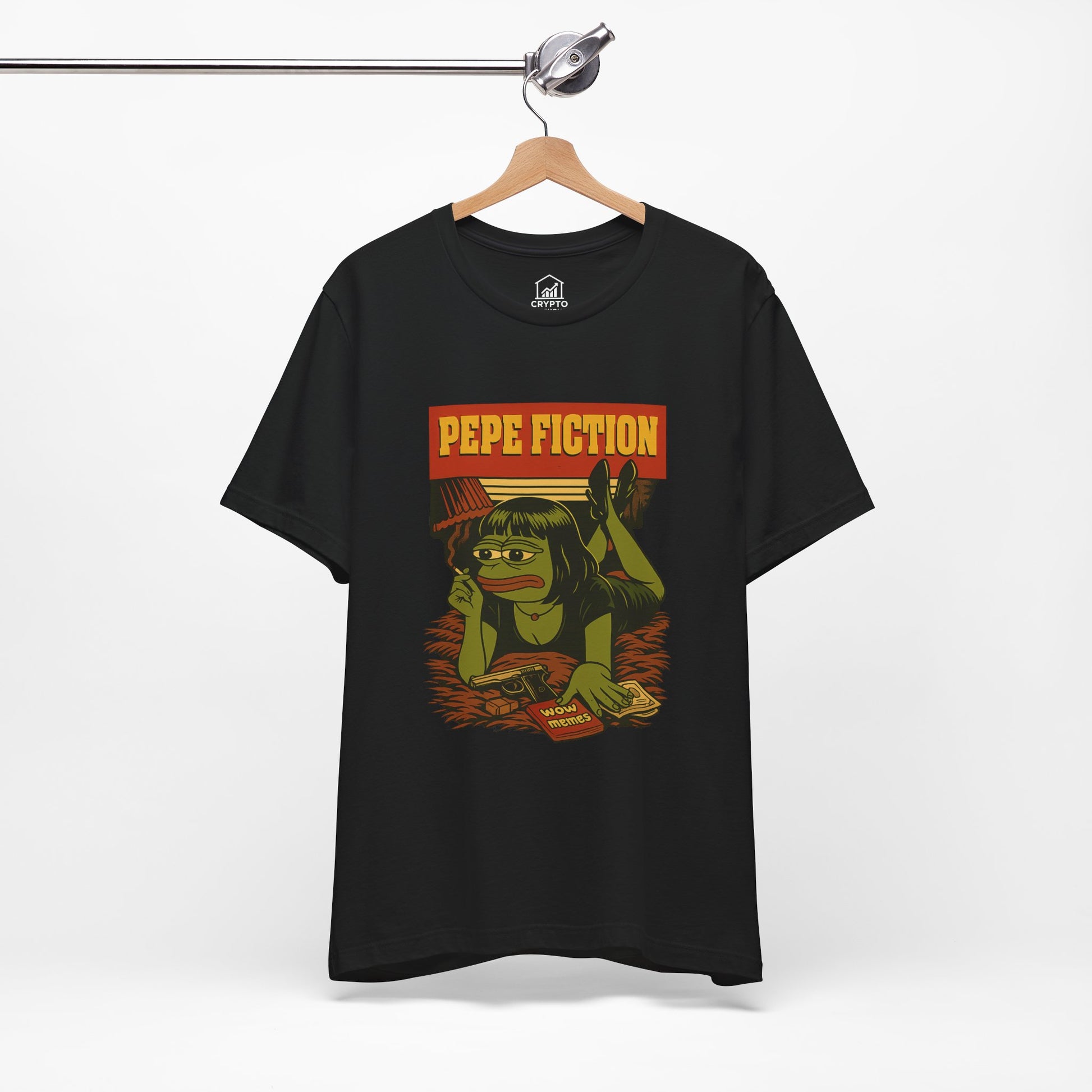 Step into the world of meme culture meets cinematic greatness with this bold and hilarious PEPE FICTION tee. Inspired by the iconic Pulp Fiction poster and reimagined with everyone's favorite degen frog, this design is a tribute to the crypto community’s wild spirit and HODL energy.