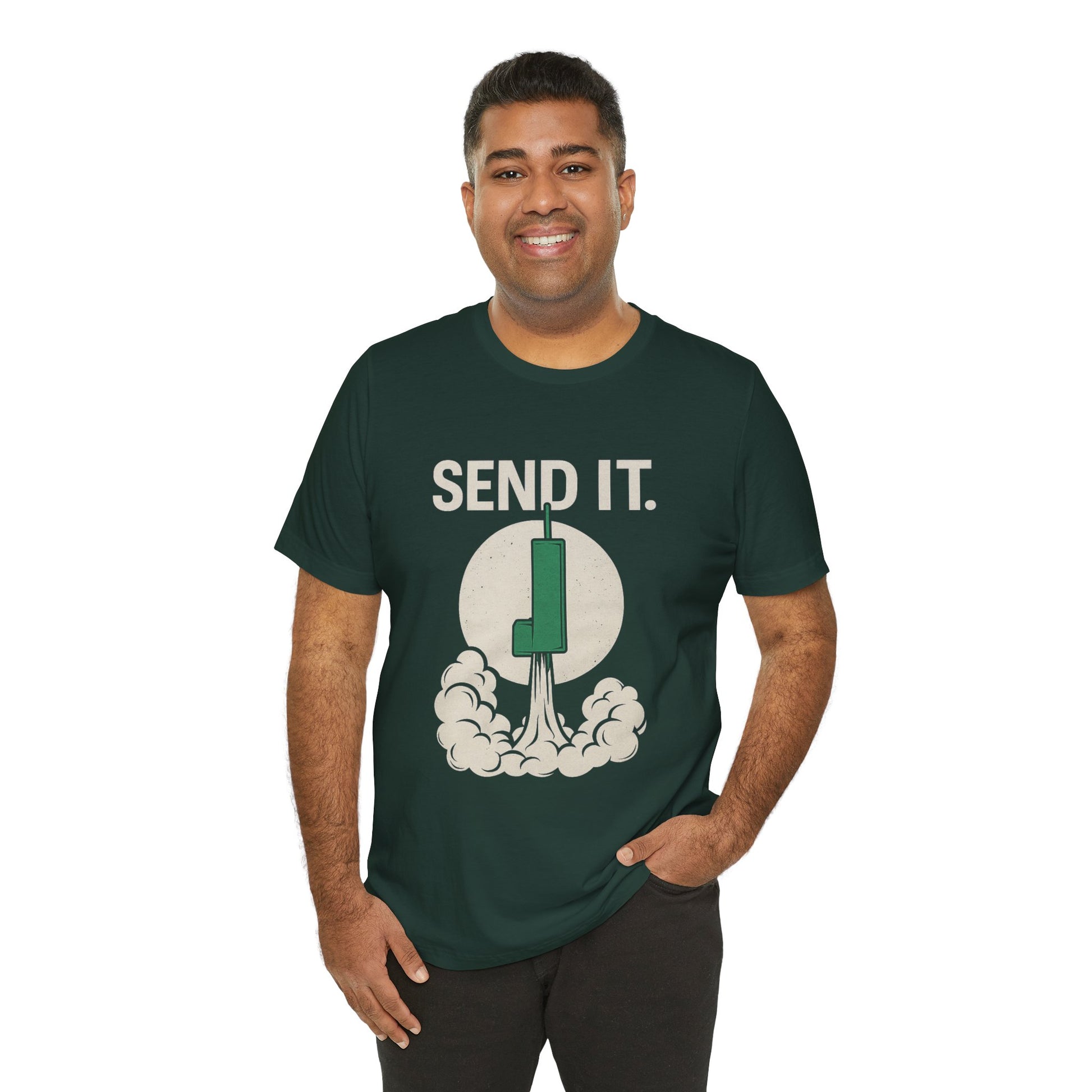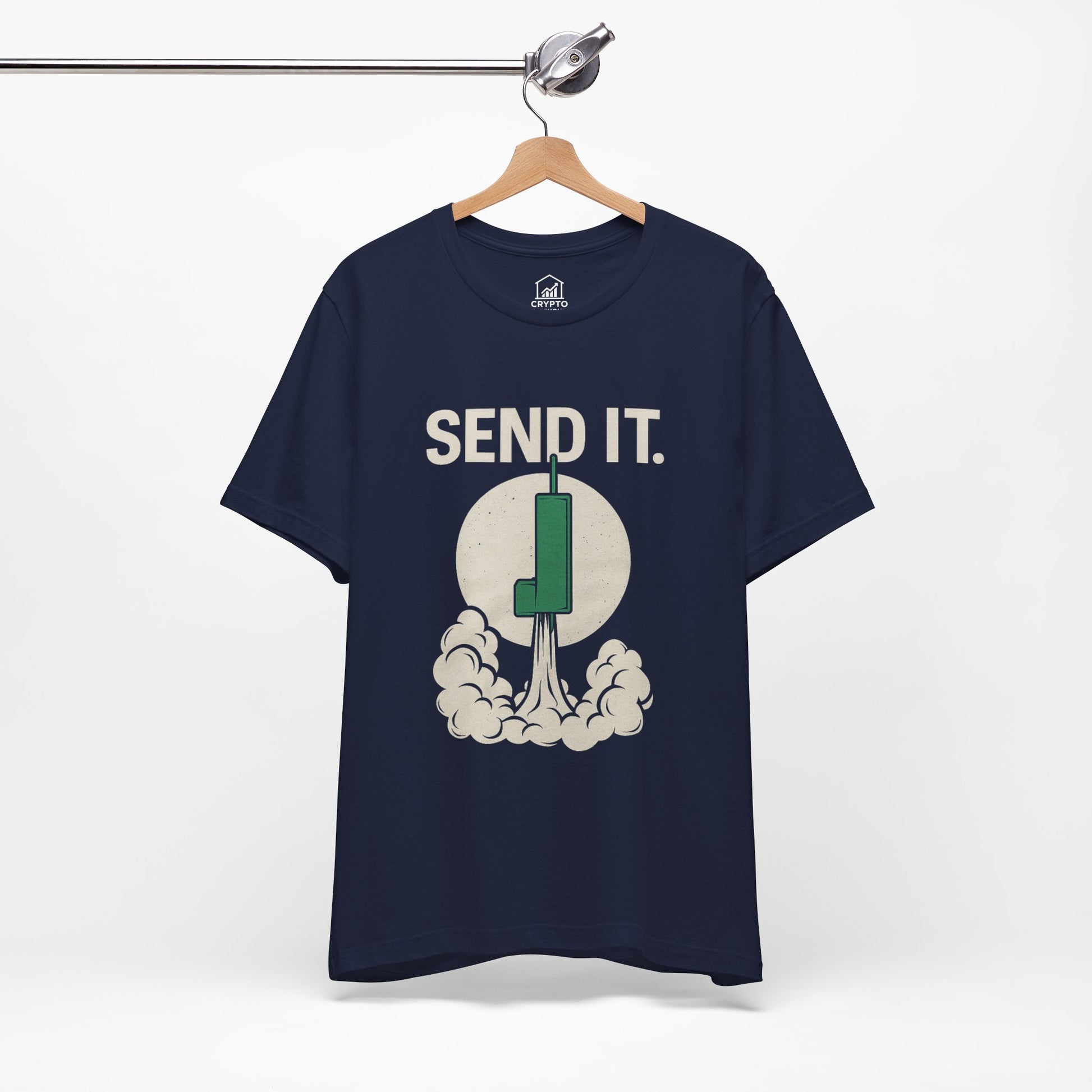 For those who know the feeling of watching a green candle blast off the charts, this SEND IT. T-shirt is your badge of honor. Featuring a bold, minimalist design of a rocket-style candlestick launching through the moon, it’s the perfect tribute to those euphoric moments when the market finally sends it.